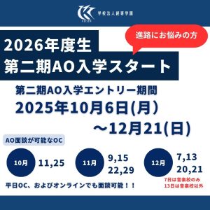 ご好評にお応えして、10/6(水)より第二期AO入学エントリースタート! まだ進路が決まっていない方、これから進路を考える方、ぜひご検討ください。 まずはオープンキャンパスに参加して☑してくださいね♪ 【エントリー期間:2025年10月6日~12月21日】